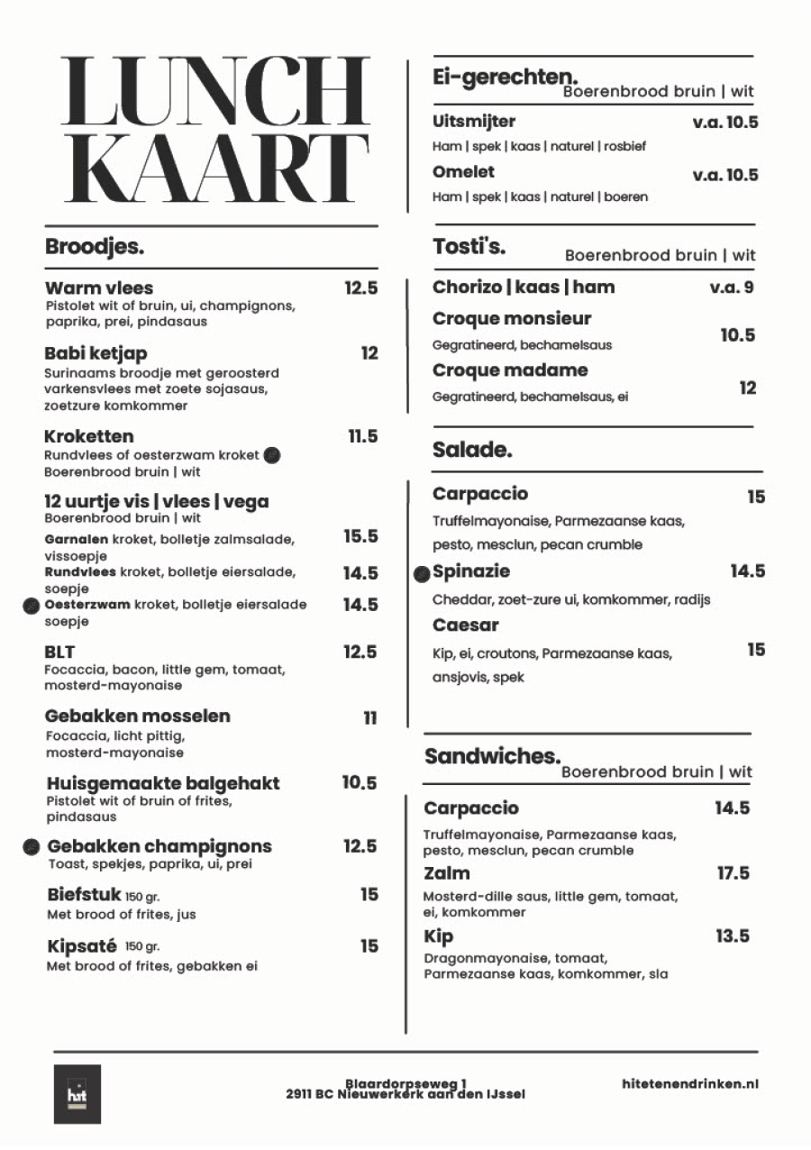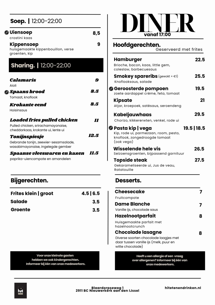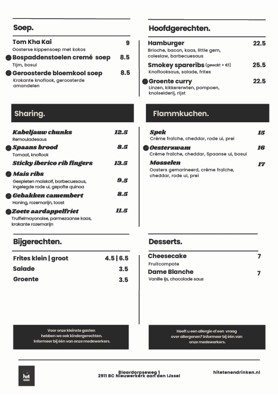 Op onze menukaart vind je altijd een gevarieerd aanbod, afgestemd op het seizoen. Wij gebruiken alleen dagverse en seizoensgebonden producten waarbij prijs én kwaliteit hoog in het vaandel staan. Op de krijtborden in het restaurant vind je onze specials.